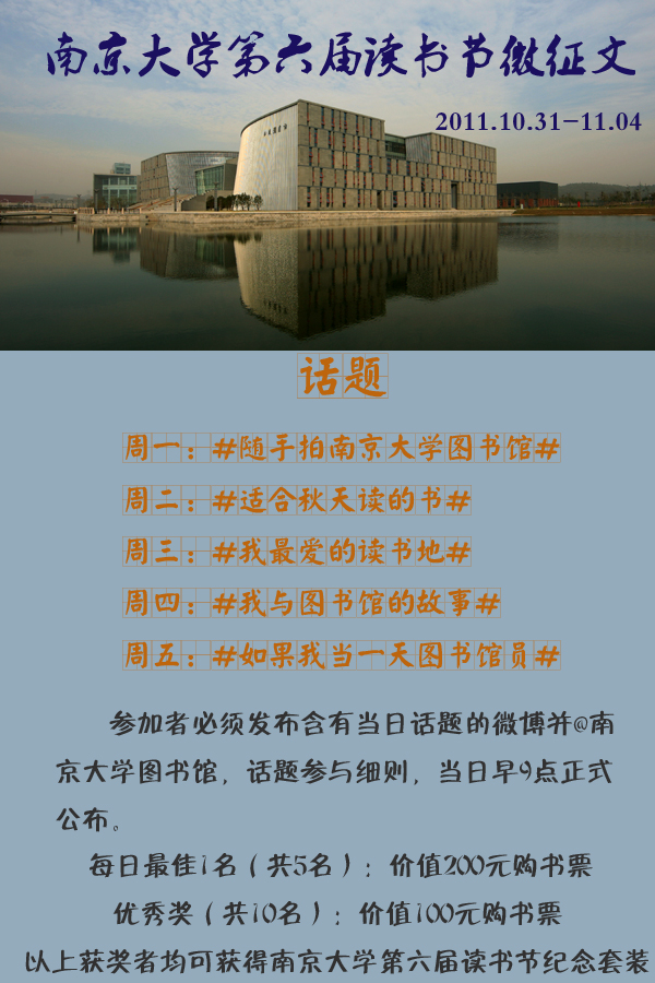 除了上述征文,本届读书节还首次推出了微征文,通过南京大学图书馆微博的平台与广大读者互动,一日一主题,分别是:随手拍南京大学图书馆(10月31日)、适合秋天读的书(11月1日)、我最爱的读书地(11月2日)、我与图书馆的故事(11月3日)、如果我当一天图书馆员(11月4日),每日评出最佳微征文1名,优秀微征文名2名。