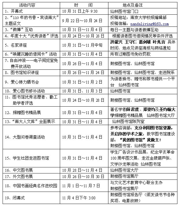 本次征文以“110年的书香·我读南大”为主题,体裁不限,1500字以内为宜。征文从即日起,至10月24日截稿,11月2日在图书馆主页公布获奖结果。来稿可以以纸质书信投递,也可以发送电子邮件,敬请在信封或电子邮件主题中注明“第六届读书节征文”字样。(电子邮件请以WORD纯文本附件形式发送,请务必写上作品题目并在文末注明作者真实姓名、院系年级或详细的通讯地址及手机号码)。投稿地址:南京大学校报编辑部,联系人李颖,电子邮件地址:nandaliying@163.com 。