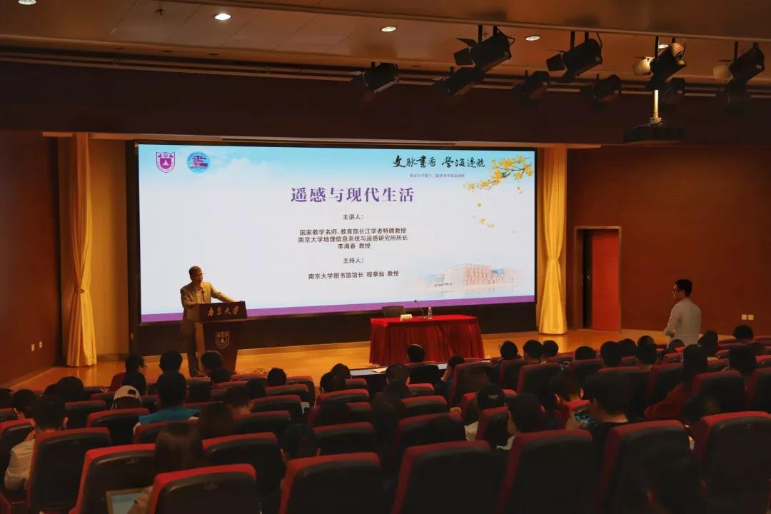 2018年10月29日晚18点30分,南京大学第十三届读书节第二场名家讲座“遥感与现代生活”在图书馆报告厅举行,讲座由国家教学名师、教育部长江学者特聘教授,南京大学地理信息系统与遥感研究所所长李满春教授主讲,南京大学图书馆馆长程章灿教授主持。
