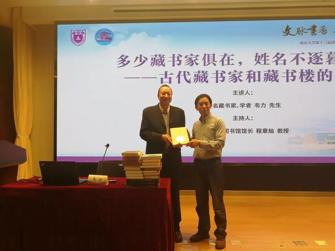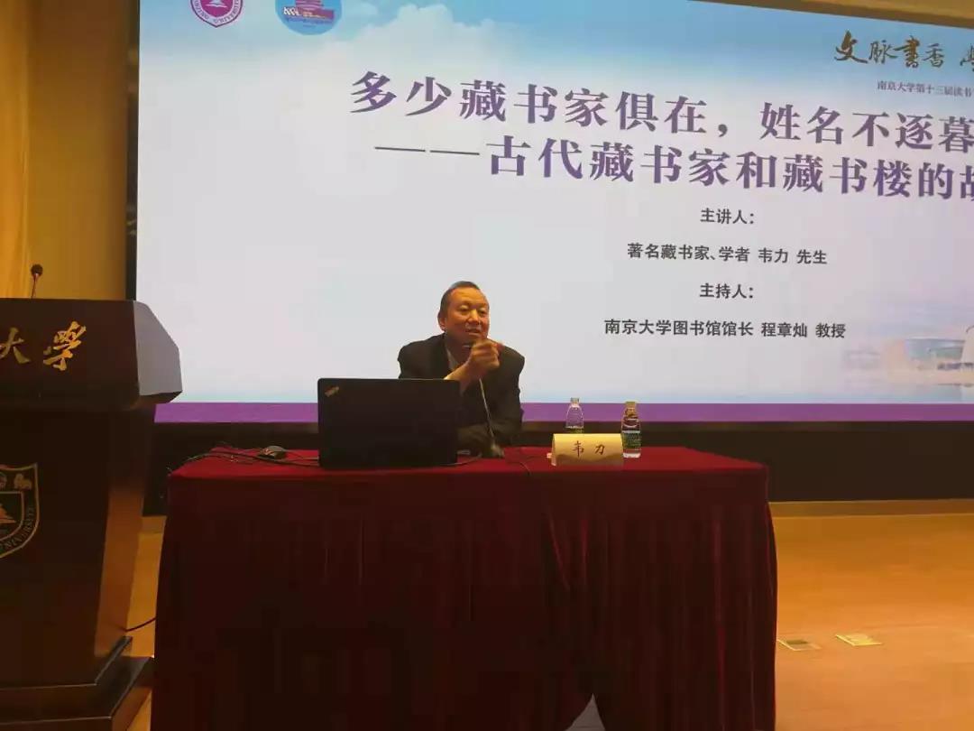 2018年10月30日晚18点30分,南京大学第十三届读书节第三场名家讲座“多少藏书家俱在,姓名不逐暮云空——古代藏书家和藏书楼的故事” 在图书馆报告厅举行,讲座由著名藏书家、学者韦力先生主讲,南京大学图书馆馆长程章灿教授主持。