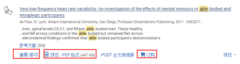 a、查看检索结果,只有同时具备“摘要”、“预览-PDF格式”、“订购”三项数据者才符合挑选提交要求。如下图:
