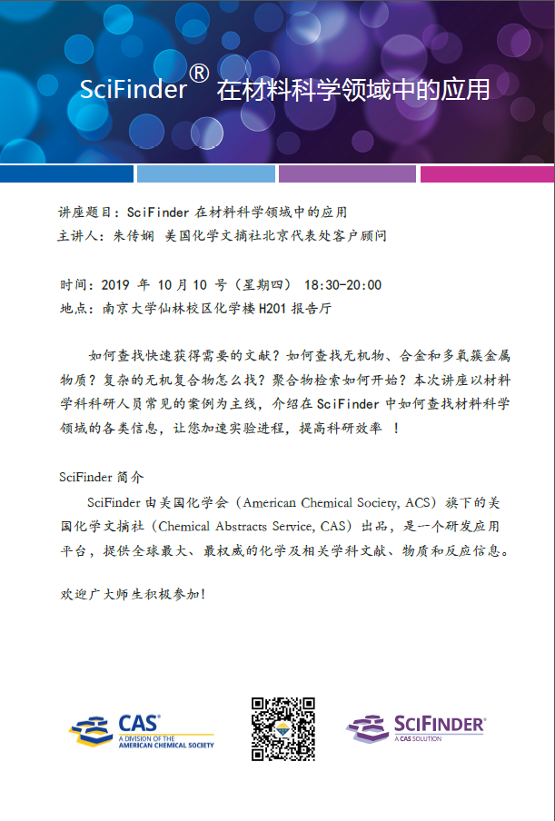 【讲座信息】10月10日图书馆知识讲座之Scifinder在材料科学领域中的应用