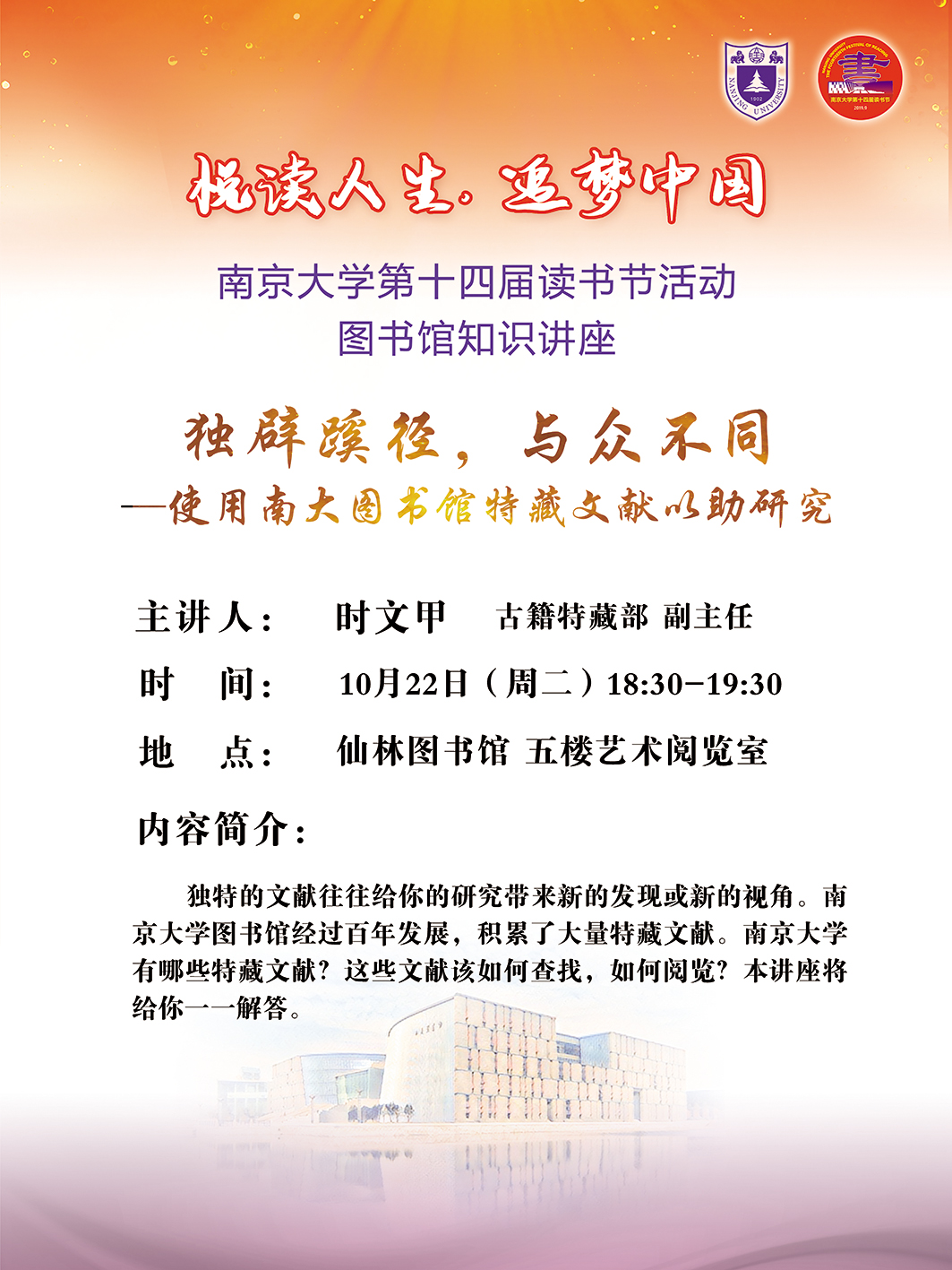 【讲座信息】10月22日图书馆知识讲座之使用南大图书馆特藏文献以助研究