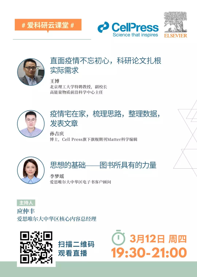 本期线上研讨会,爱思唯尔大中华区核心内容总经理应仲丰担任主持人,邀请北京理工大学特聘教授、副校长王博,Cell Press旗下旗舰期刊Matter科学编辑孙吉庆博士,以及爱思唯尔大中华区电子书客户顾问李梦瑶,分享科研经验,提供科研建议,一起探讨做科研的初心、创新、好奇心。