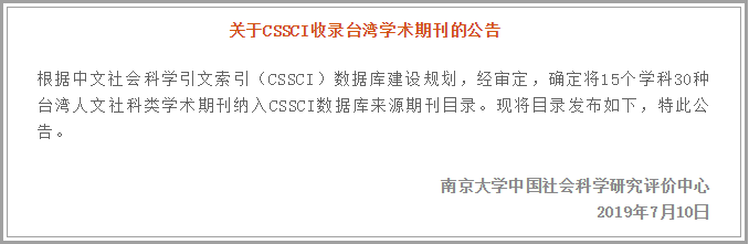 2019年7月,南京大学中国社会科学研究评价中心发布“关于CSSCI收录台湾学术期刊的公告”,确定将15个学科30种台湾人文社科类学术期刊纳入CSSCI数据库来源期刊目录。