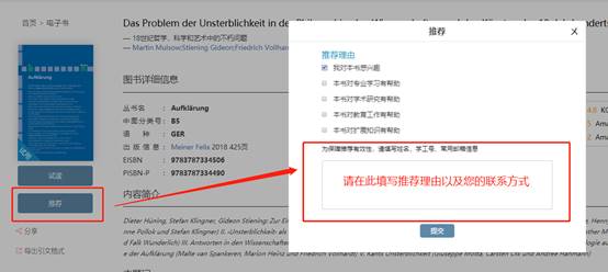 在图书详情页,点击“推荐”或“我想读全文”按钮,填写推荐理由及个人信息后(为方便图书馆联系写了推荐书评的获奖读者,请留下您的真实手机号、邮箱),点击提交即可。