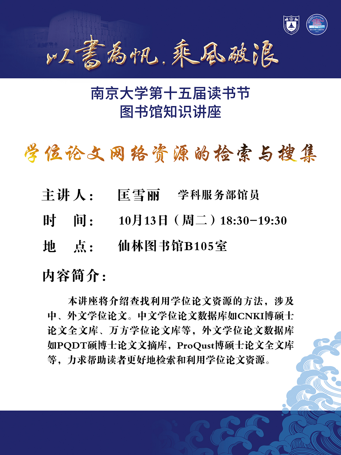 友情提醒:本次读书节知识讲座安排在仙林图书馆一楼培训教室B105,请从图书馆西侧一楼报告厅入口处进入。