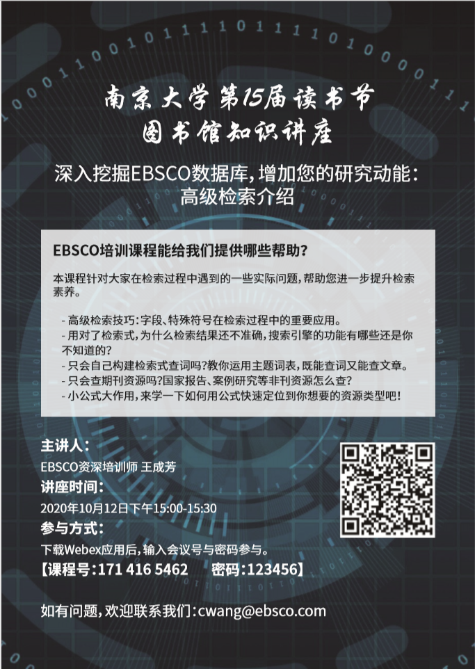 【讲座信息】10月12日图书馆知识讲座之深入挖掘EBSCO数据库,增加您的研究动能