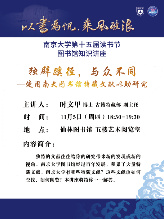 【讲座信息】11月5日图书馆知识讲座之使用南大图书馆特藏文献以助研究