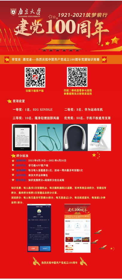 建党百年,峥嵘岁月,超星学习通APP推出全新党建云学习平台,并针对我校师生,组织了此次“学党史,跟党走”热烈庆祝中国共产党成立100周年党建知识竞赛,欢迎大家参与答题并赢取大奖!