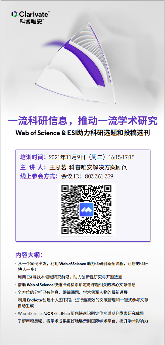 【讲座信息】11月9日图书馆知识讲座之WOS & ESI在科研选题和选刊投稿中的应用