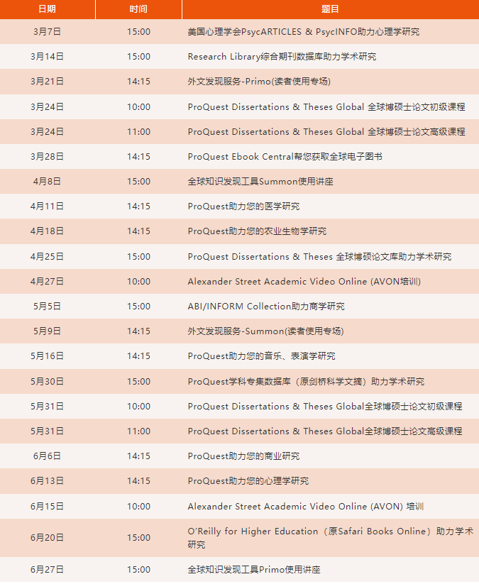 为了使读者能够更好的利用ProQuest电子资源,ProQuest推出了“ProQuest网络课堂”。每场培训20-30分钟,均为网络实时进行,无IP限制,需提前注册(点击课程课程注册链接,输入个人信息完成注册)。培训期间可针对ProQuest产品提出问题并与ProQuest培训师进行实时交流,读者对培训课程有任何建议、遇到任何技术问题或对其他产品有培训需求,可发邮件至:Chris.Guo@proquest.com 或 jim.wang@proquest.com 进行咨询。