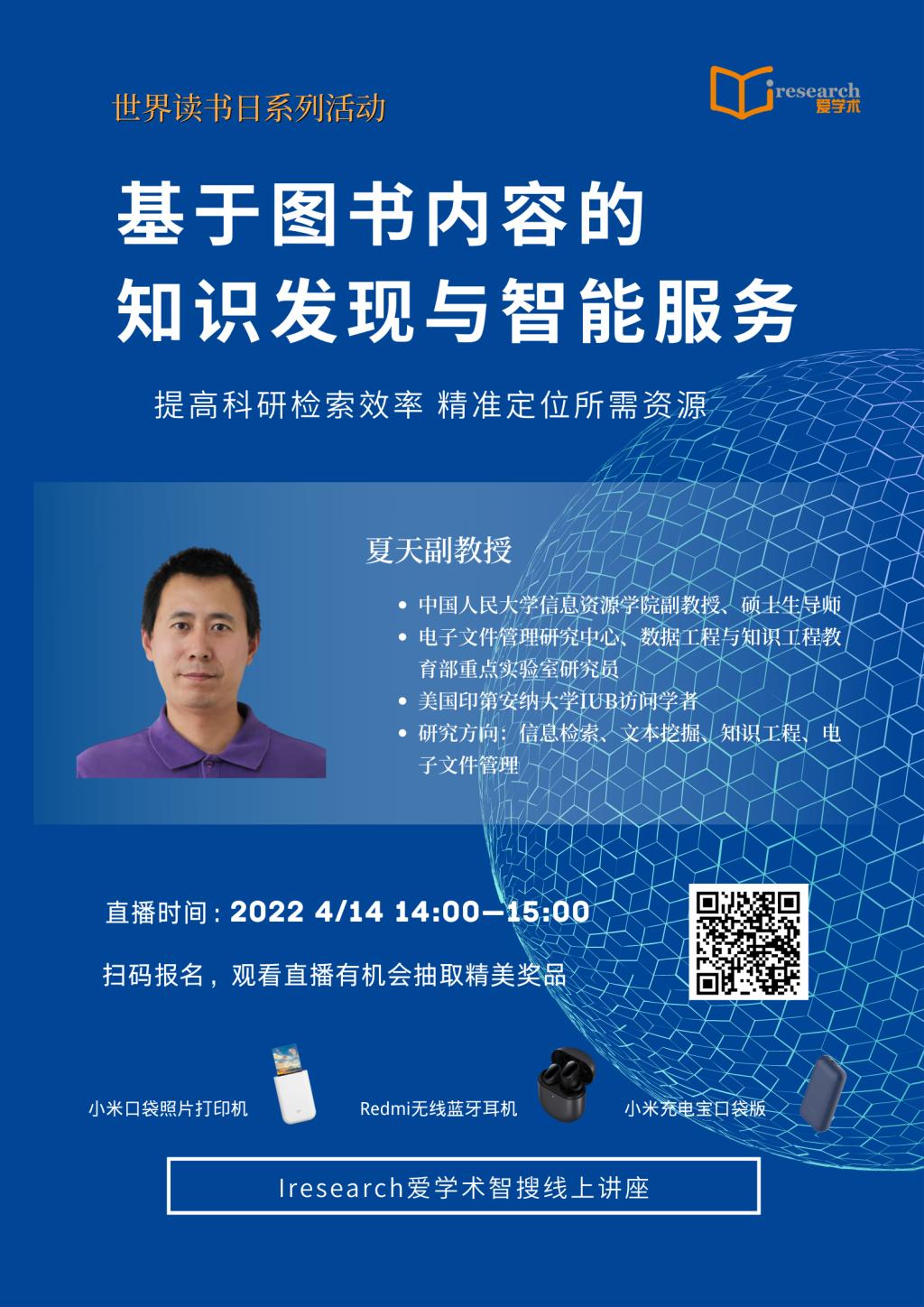 Iresearch爱学术平台邀请中国人民大学信息资源管理学院夏天副教授,举办线上主题讲座——“基于图书全内容的知识发现与智能服务”,与大家共同探讨知识发现技术在图情领域的应用和发展。