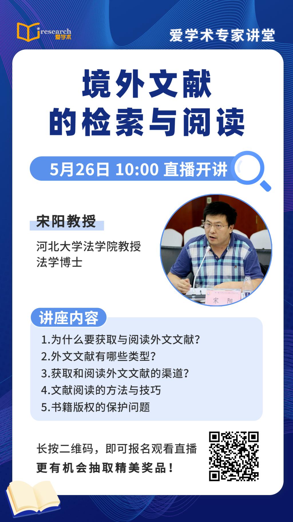 为助力疫情期间广大院系师生、科研学者、图书馆员等掌握高效的外文文献检索方法,实现精准高质的外文阅读,爱学术专家讲堂荣幸邀请到河北大学法学院宋阳教授,举办线上主题讲座——“境外文献的检索与阅读”。本期讲座将从获取与阅读外文文献的必要性切入,重点讲解获取外文文献的渠道和阅读文献的方法技巧。欢迎扫描下方二维码,报名参加讲座!