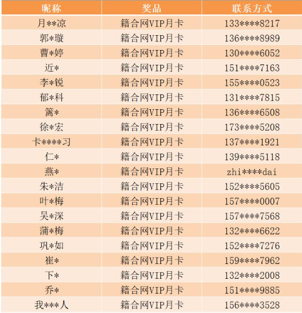 一等奖:工作人员将发送籍合网VIP月卡兑换码至您的手机,届时请关注手机短信;