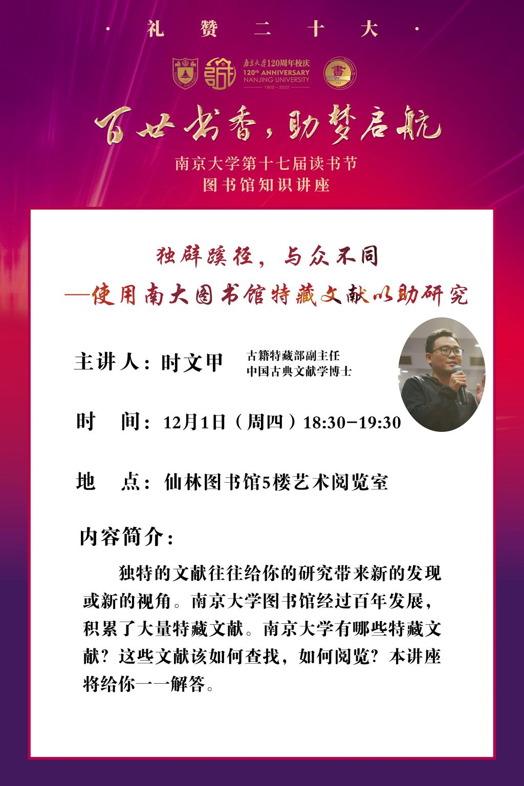 【讲座信息】12月1日图书馆知识讲座之使用南大图书馆特藏文献以助研究