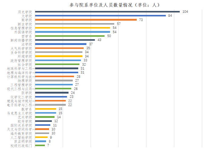 有34个院系单位的师生参与了本次活动,其中历史学院人数最多有104人,其次为文学院和商学院分别有94人和73人。从院系单位统计看,文史哲等相关院系单位的师生对图书馆活动更为关注,大气科学学院、生命科学学院、环境学院等理工科院系师生参与度较高。