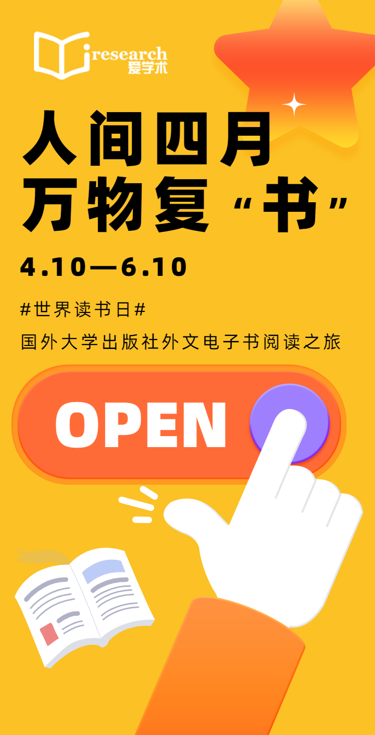 人间四月,万物复“书”!为迎接“2023.4.23世界读书日”的到来,爱学术(iresearch)即日起正式推出“世界读书月—国外大学出版社外文电子书开放阅读” 活动,活动为期2个月。本次活动甄选平台3000余种国外大学社精品资源,面向读者倾情开放,全部支持在线阅读全文。这个读书月,让我们以书为媒,打破国界,拥抱多元,去感受与思考这个世界吧!