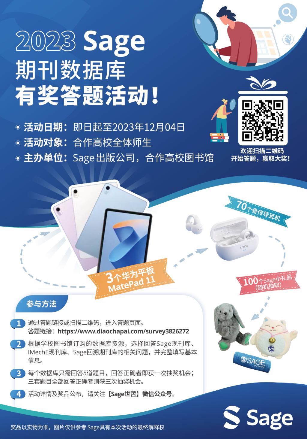 1. 我校图书馆可访问Sage现刊库和Sage回溯期刊库,在校园网范围内,通过答题链接或扫描二维码,即可进入答题页面:https://www.diaochapai.com/survey3826272