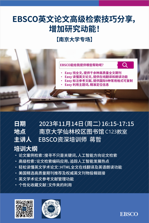 【讲座信息】11月14日图书馆知识讲座EBSCO英文论文高级检索技巧分享