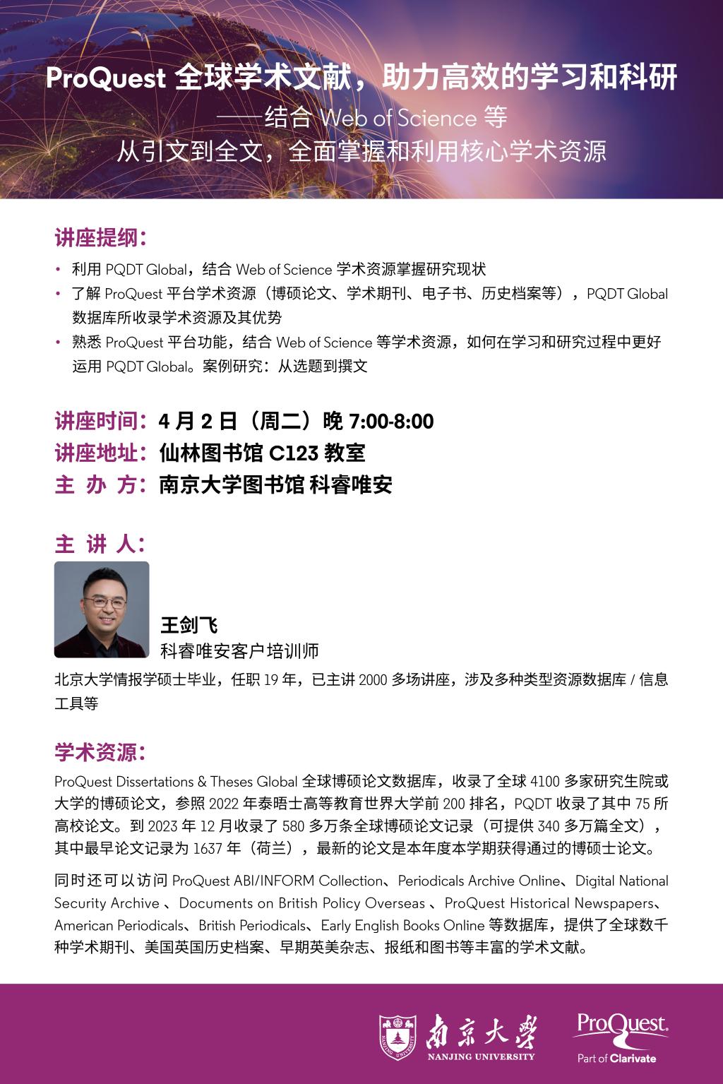 【线下讲座】4月2日ProQuest全球学术文献助力高效的学科和科研