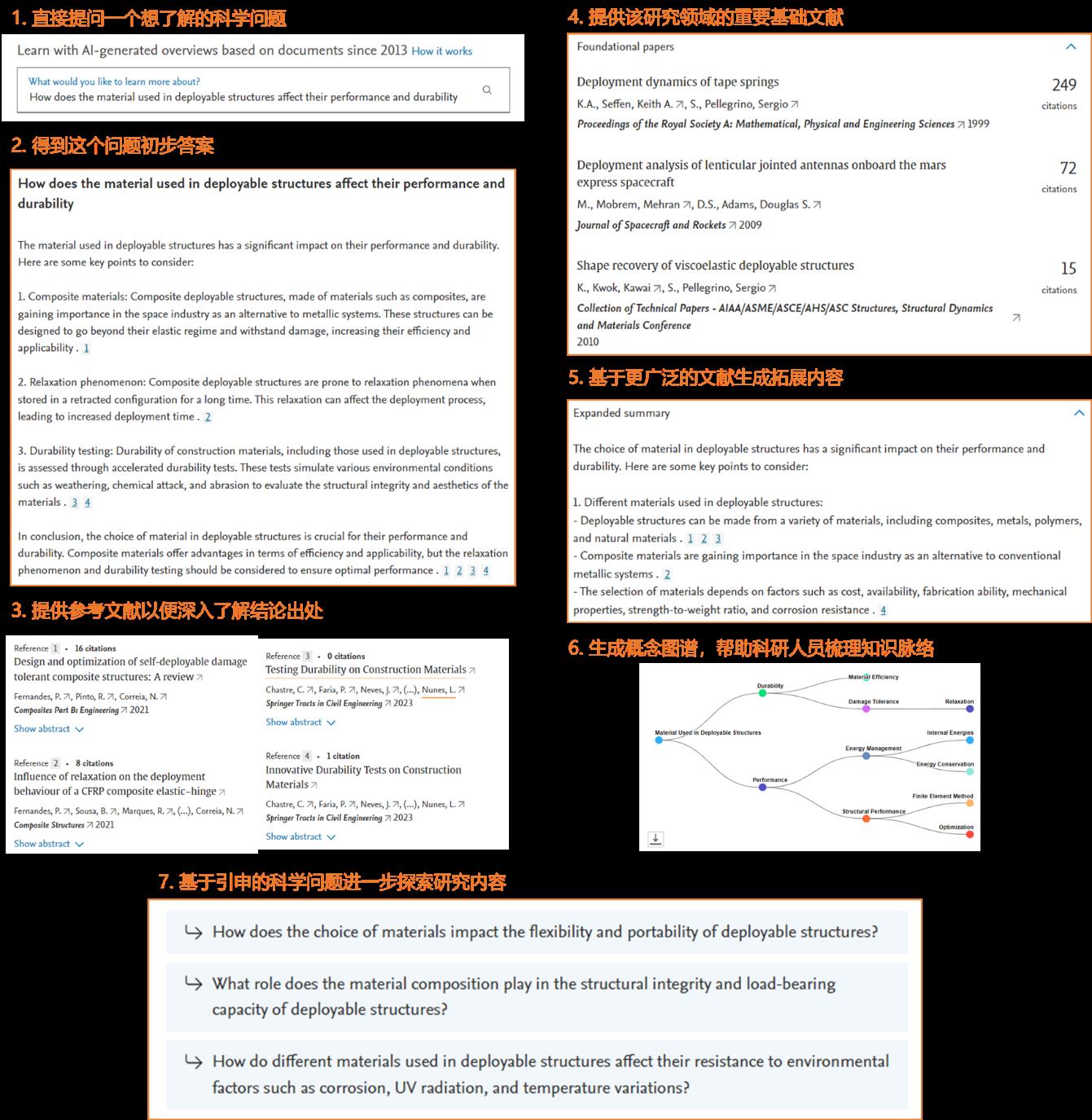Scopus AI是采用生成式AI技术研发的专门用于科研发现的AI工具。其用于生成内容所使用的数据来自全球最大同行评议数据库Scopus中超过27800万种学术期刊、约15万种会议录以及30万本图书中的权威内容。其使用方式采用自然语言提问的方式,由用户向Scopus AI提出一个科学问题,Scopus AI会识别问题的语义并检索2013年以来整个数据库中与该科学问题最为相关的文献,生成一个针对用户提问的答案,并以思维导图的形式输出这一研究领域的知识脉络,帮助用户理解这一研究领域的发展现状。同时,Scopus AI还会给出每一句答案所引用的参考文献,确保答案的可靠性;列出该研究领域的奠基性文献和领域专家,帮助用户更全面的了解这一研究领域的发展历程以及重要学者;最后Scopus AI还会引申出与用户提问问题相关的最受研究人员关注的三个拓展问题,让用户通过这些问题从更深的层次以及更广的范围了解这一研究领域。最终,帮助用户将梳理清相关科研问题的发展现状以及研究脉络。Scopus AI的使用方式如图1所示。