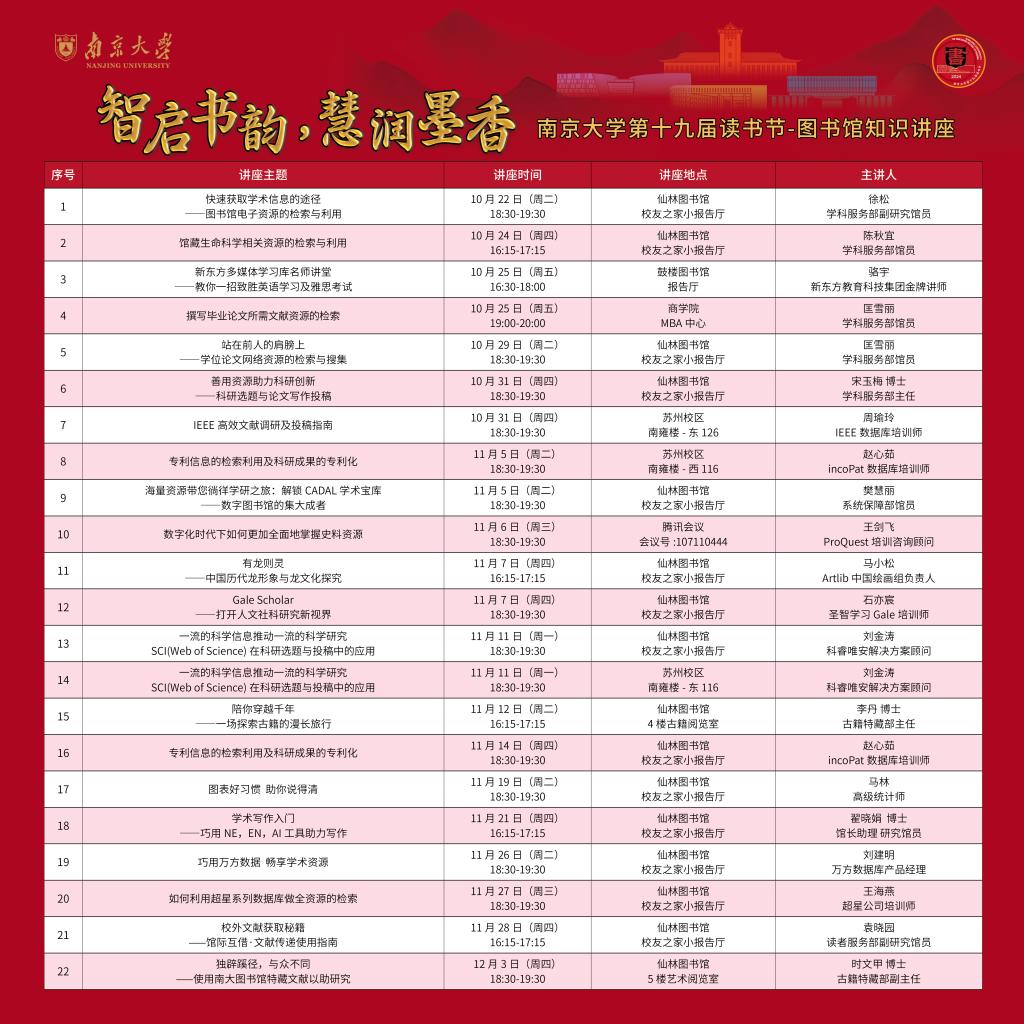 友情提醒:仙林图书馆校友之家小报告厅位于图书馆一楼大众书局旁,图书馆正南大台阶下校友之家1号门或西侧5号门进大众书局均可通。