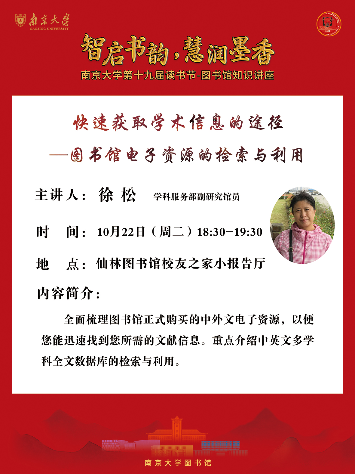 友情提醒:仙林图书馆校友之家小报告厅位于图书馆一楼大众书局旁,从1号门或5号门进入均可。