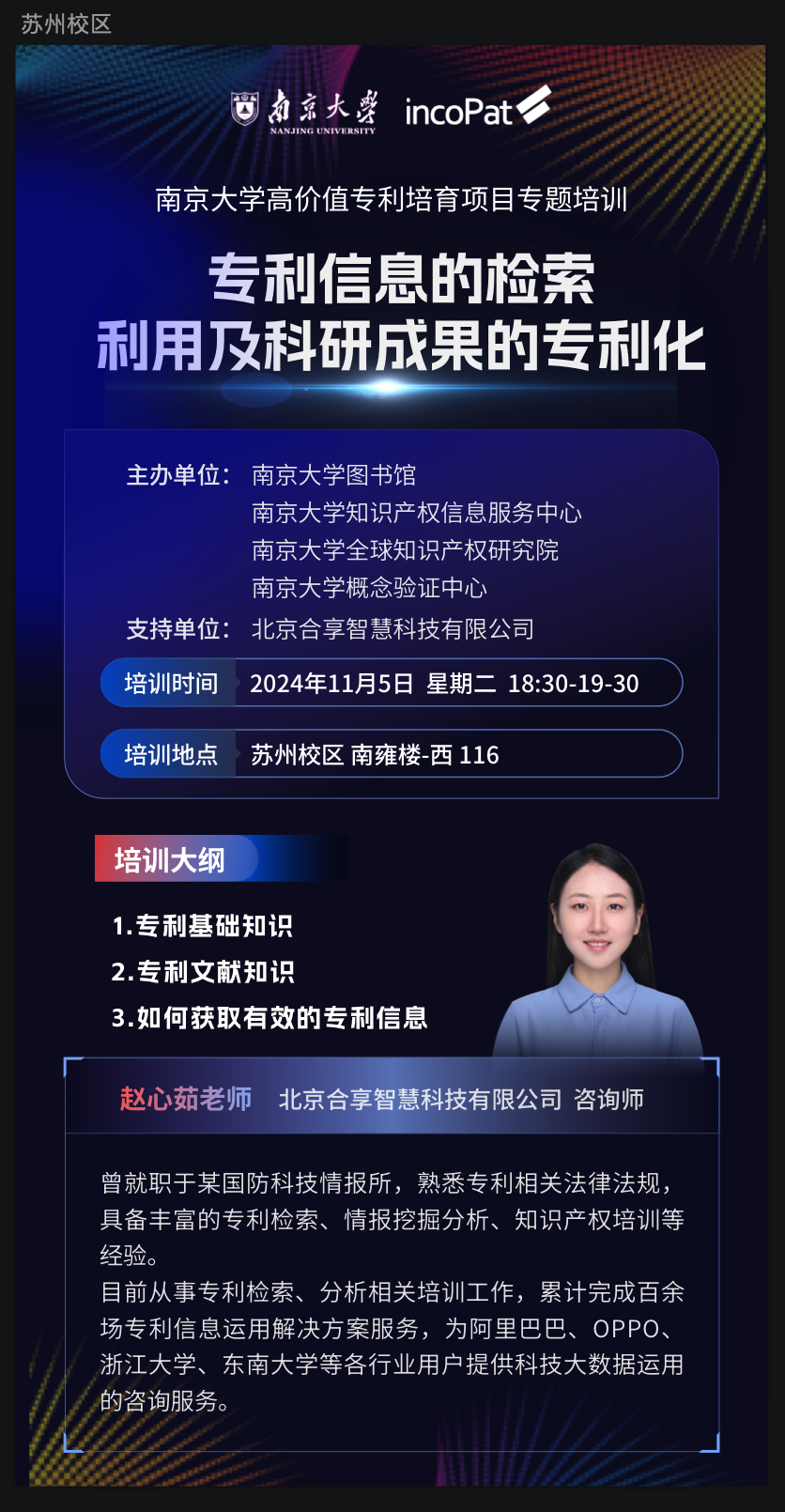 【讲座信息】11月5日图书馆知识讲座之专利信息的检索利用及科研成果的专利化