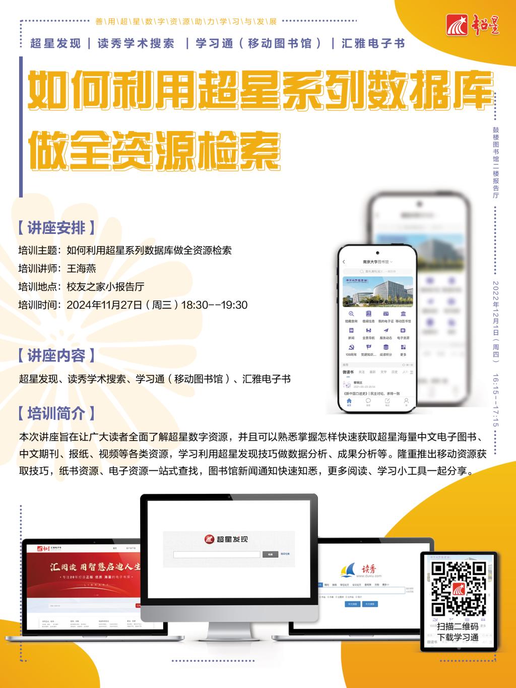【讲座信息】11月27日图书馆知识讲座之利用超星做全资源检索