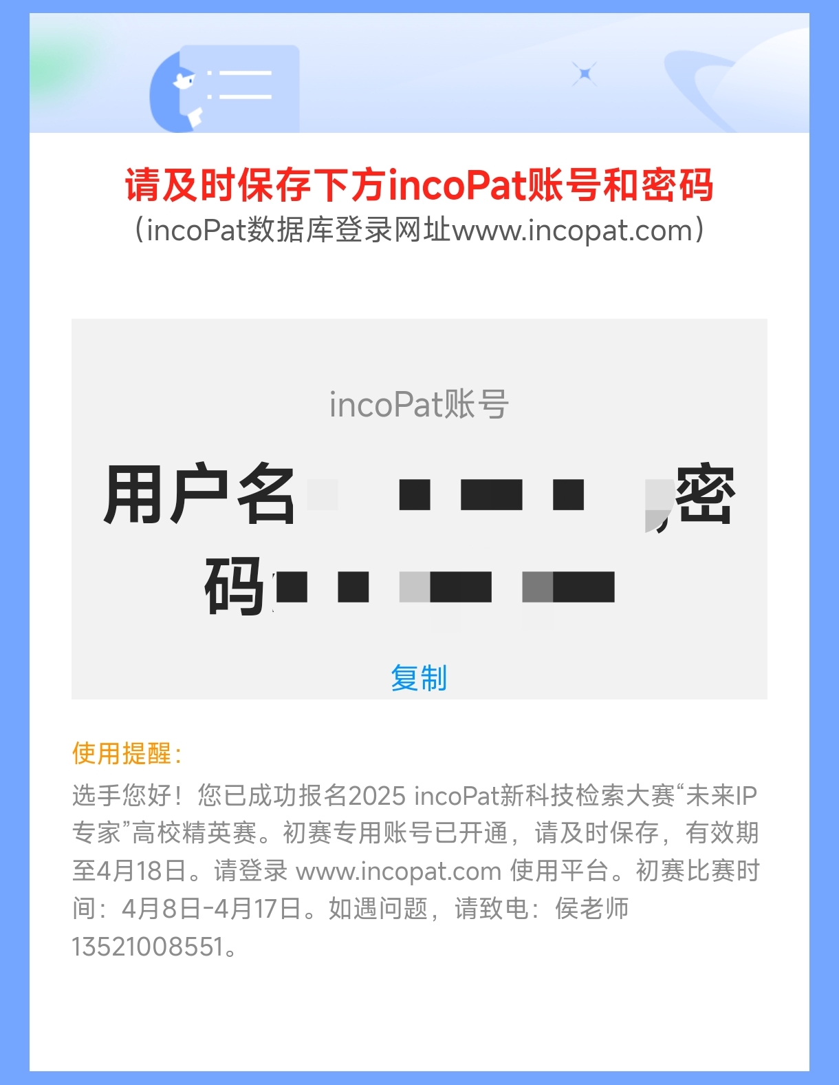 赛前报名时间3月18日-4月16日,参赛选手在此阶段报名成功后,建议按时参加组委会提供的三场赛前直播培训,以便能够快速了解和使用本届大赛的专用检索工具——incoPat专利数据库,充分掌握检索技巧,为比赛做好充足的准备。直播培训时间分别在3月25日、4月1日以及4月9日的15:00-16:00,欢迎大家准时观看。
