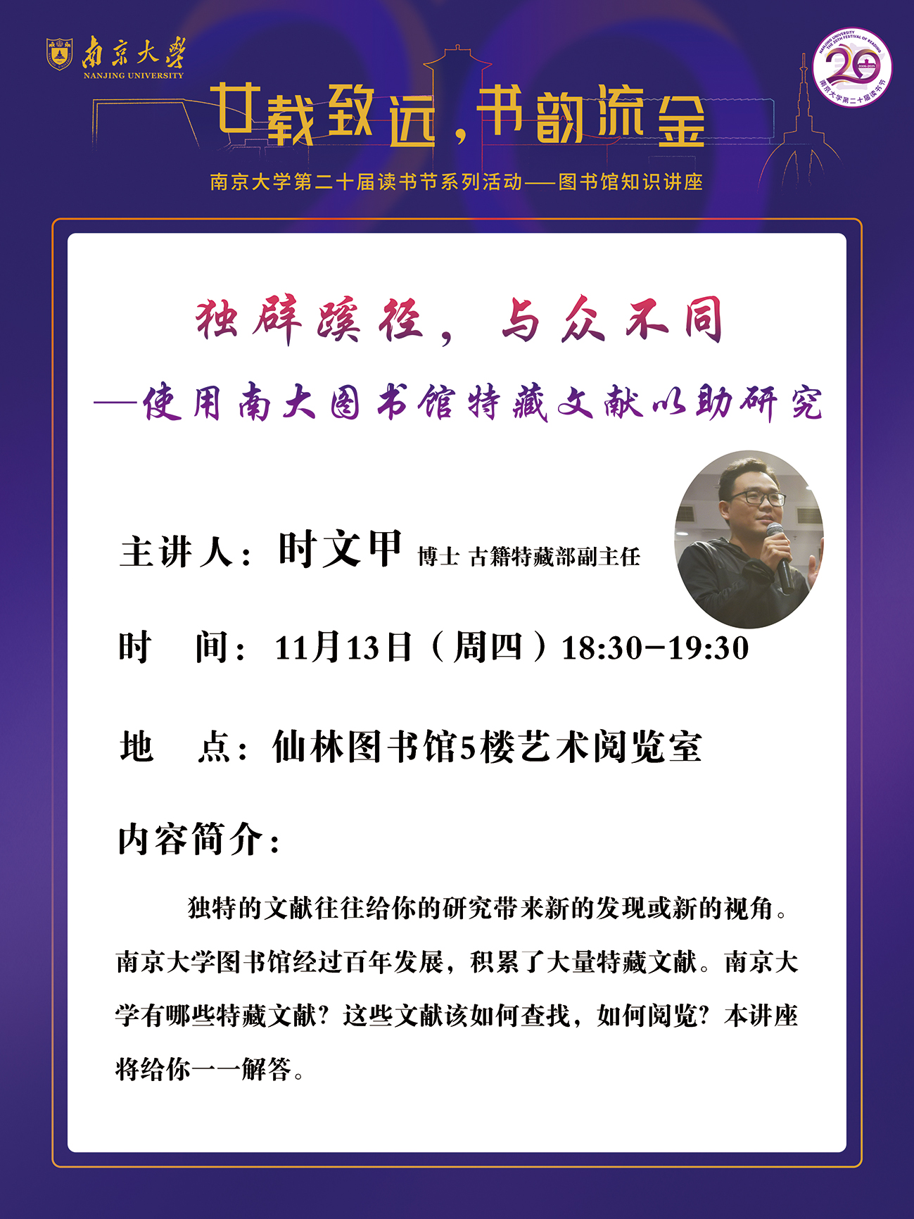 【讲座信息】11月13日图书馆知识讲座之使用南大图书馆特藏文献以助研究