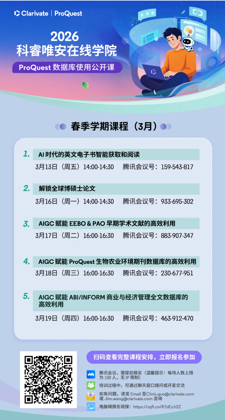 欢迎参加“科睿唯安在线学院——ProQuest 数据库使用公开课”3月课程,了解如何借助 AIGC (人工智能自动生成内容),更高效地检索与利用 ProQuest 丰富的外文学术资源,提升学习与研究效率。