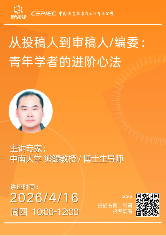 为了揭开审稿的“黑匣子”,帮助广大青年学者从编委和审稿人的视角重新审视论文发表,中国教图科研服务联合Bentham Science Publishers,共同推出i学术专家讲堂第18期!中南大学湘雅基础医学院人体解剖学与神经生物学系主任熊鲲教授,将带来一场双重视角的深度分享:《从投稿人到审稿人/编委:青年学者的进阶心法》。熊教授将以投稿人+编委的双重身份,带你拆解一篇稿件从Submit到Accept/Reject的完整生命周期,揭示审稿流程中的"隐藏规则",助你掌握论文发表的通关密码。