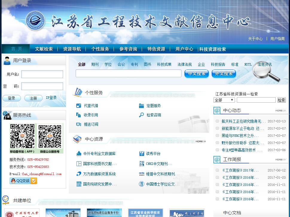 “江苏省工程技术文献信息中心”(以下简称“中心”)是 2004 年江苏省启动建设的四大科技公共基础服务平台之一,也是江苏区域科技创新的文献信息保障服务平台。“中心”按照“统一规划,共享共建;公益为主,滚动发展”的原则,通过集成江苏省科、教、文三大系统所属十家单位的文献信息资源,与国家科技图书文献中心 NSTL 合作,联合向全省开放服务。 “中心”平台是国内权威的数据库资源平台,“中心”以元数据仓储为底层架构,彻底整合集成了十家共建单位的 61 个国内外核心全文数据库的全部检索数据,元数据总量超过 2.1 亿条,开通包括期刊、学位、标准、专利、成果等 12 个检索频道,23 个数据检索入口。