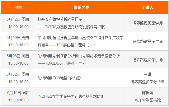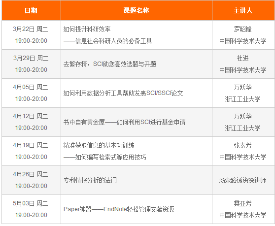 2016年3月22日汤森路透WOS春季在线大讲堂,开始开讲。本学期来自知名高校的专家和汤森路透的资深讲师将通过13节精彩的在线免费课程,和大家一起在浩瀚的学术文海中捕捉激发科研创新的闪光灵感、在科研创新生命周期中玩转从探索发现到成果转化的每个阶段,并将聚焦“成果转化”探讨如何运用专利数据和情报分析工具乐享创新成果。欢迎老师同学们参与!科研与研发人员专场