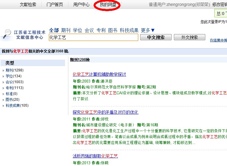 在检出的结果中,点击需要的文献标题,在出现的页面中,点击存到网盘,然后等待文献传递,文献传递结果可以点击最上面的我的网盘查看。