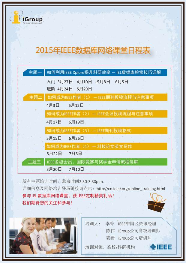 为了更好地提供IEL数据库培训以及加强与终端用户的沟通,本学期IEEE将每周提供一次网络培训。为了方便记忆,培训时间统一定为周五下午2:30-3:30,如果您所在学校或机构在时间/内容方面有特别需求,请单独联系li.q@ieee.org。培训内容分为五个主题,分别涉及数据库检索技巧、期刊会议投稿流程、学会资源与会员权益、IEEE标准概览以及图书馆员分享专场,请各位按兴趣届时登录。