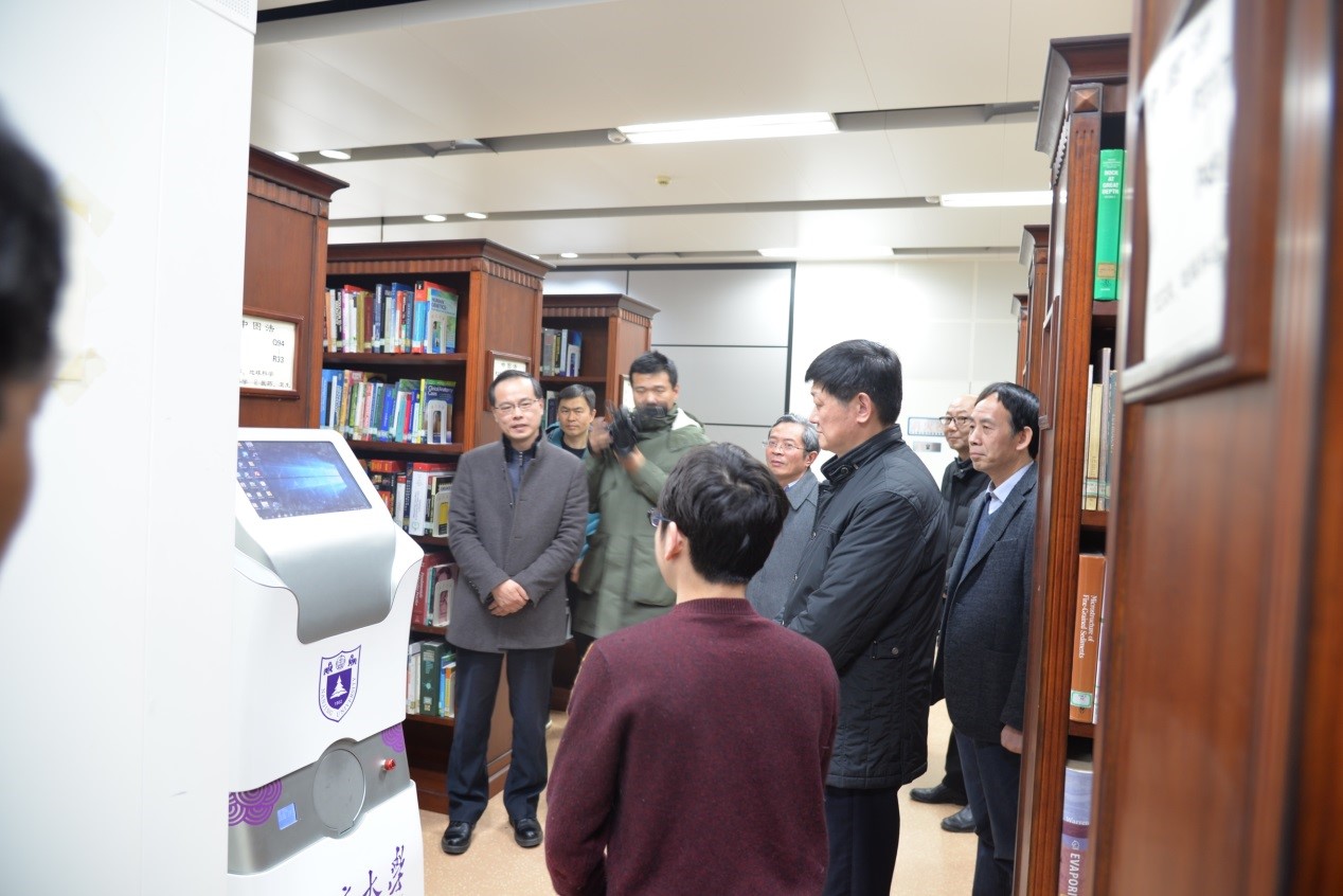 2019年2月25日,江苏省政协副主席、南京大学党委书记胡金波,党委常务副书记杨忠来南京大学图书馆调研。参观了古籍阅览区、民国与港台文献阅览区、古籍书库,与咨询机器人图宝、盘点机器人互动并与图书馆教职工座谈交流。胡金波书记指出,图书馆作为南大地标性的建筑,是学校基础建设很重要的一块,我们要建设“第一个南大”,首先要建设“第一个图书馆”。