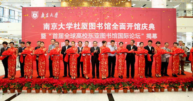 10月29日上午,南京大学杜厦图书馆全面开馆庆典暨“首届全球高校东亚图书馆国际论坛” 、“南京大学第七届读书节”开幕式在南京大学仙林校区杜厦图书馆举行。江苏省人民政府曹卫星副省长,全国人大常委、我校陈骏校长,江苏省教育厅杨湘宁副厅长,江苏省文化厅马宁副厅长,我校电子科学与工程学院吴培亨院士,我校杰出校友杜厦先生等省领导和嘉宾;教育部高校图工委秘书长、北京大学图书馆朱强馆长,哈佛大学哈佛-燕京图书馆郑炯文馆长,哥廷根大学图书馆Johannes Reckel教授,首尔大学奎章阁韩国学研究院金仁杰院长,台湾大学图书馆陈雪华馆长,香港大学图书馆尹耀全副馆长,澳门科技大学图书馆戴龙基馆长等海内外30余位嘉宾;江苏省100多所高校图书馆及南京图书馆与情报所的图书馆同仁;数百名南大师生代表出席了全面开馆仪式。周宪校长助理主持庆典。