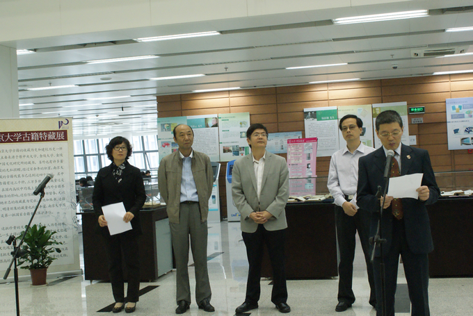 校长助理周宪教授致词。周校助说,在喜迎我校110周年校庆的日子里,在仙林杜厦图书馆举行“南京大学古籍特藏展暨南京大学珍贵文献修复展”非常有意义!经过百余年的发展,我校所藏的古籍线装书已达近四十万册,其中善本古籍有近三千种,三万多册,无论数量还是质量,在国内高校中均属上乘,在海内外也有相当的影响。今天,部分善本古籍的陈列展出,彰显了南大深厚的文化底蕴,而“珍贵文献修复展”,一方面展示了邱晓刚老师和他的学生们多年的修复成果,更重要的是让所有南大人备加爱护和珍惜这些来之不易的书籍,并充分利用这些文化典籍,为南京大学的教学和科研做出更大的贡献!