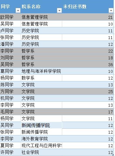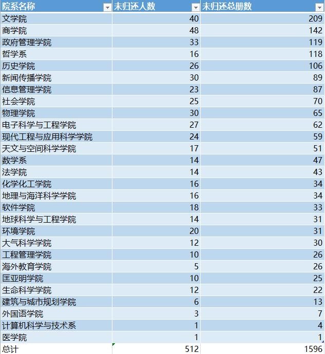 以下是各院系未归还图书总数和未归还人数