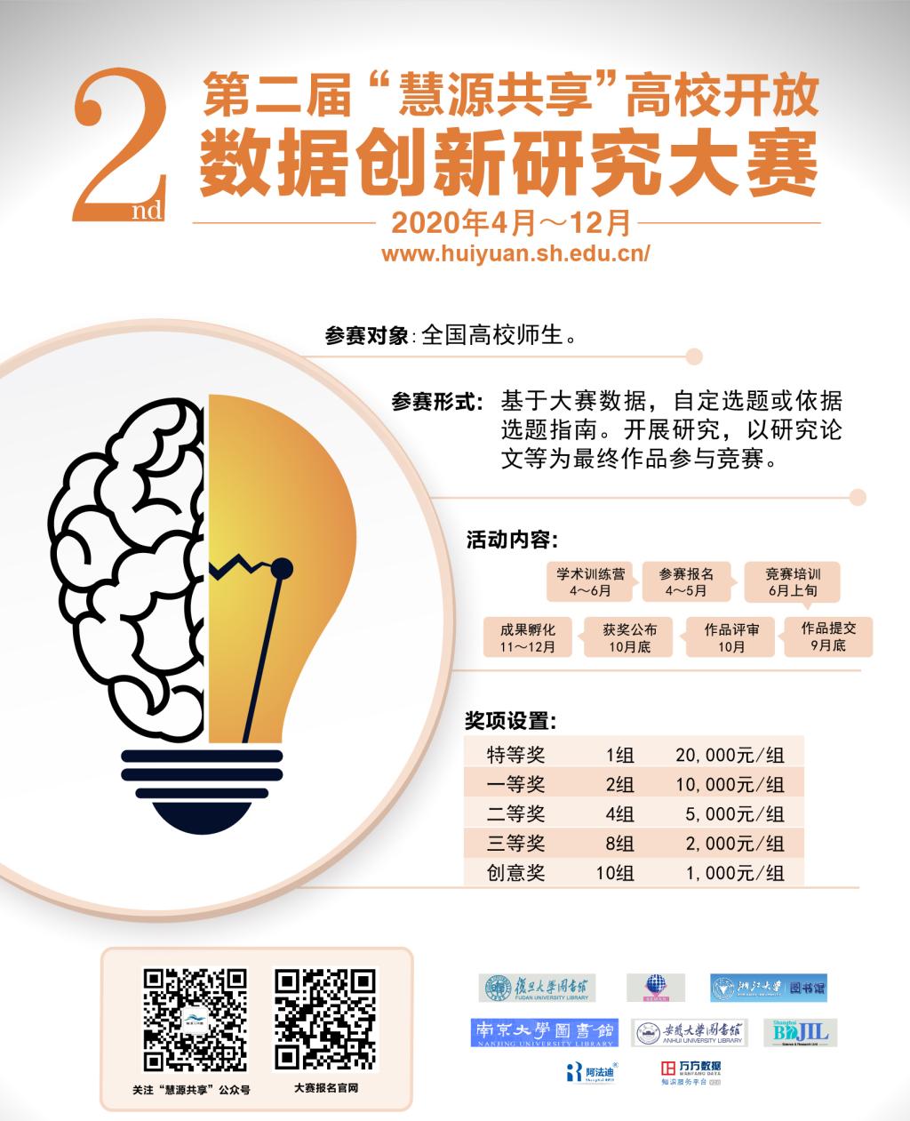 为推动和促进教育科研领域数据资源的汇聚流通和共享开放,鼓励高校师生利用新技术对开放数据进行创新研究与应用,聚合各行业力量培养和提升大学生的数据素养,在上海市教育委员会、上海市经济和信息化委员会的指导与支持下,复旦大学图书馆、上海市教育委员会信息中心和上海市科研领域大数据联合创新实验室联合多家高校和企业,面向全国高校师生举办第二届“慧源共享”高校开放数据创新研究大赛系列活动。