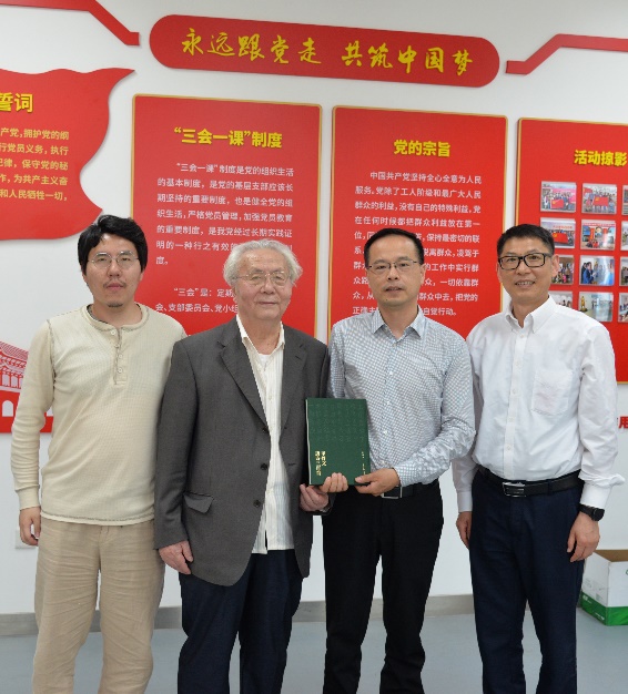 图1 邵波副馆长代表图书馆接受赠书(左起:唐玉田教授家属、唐玉田教授、邵波副馆长、张锁庚秘书长)