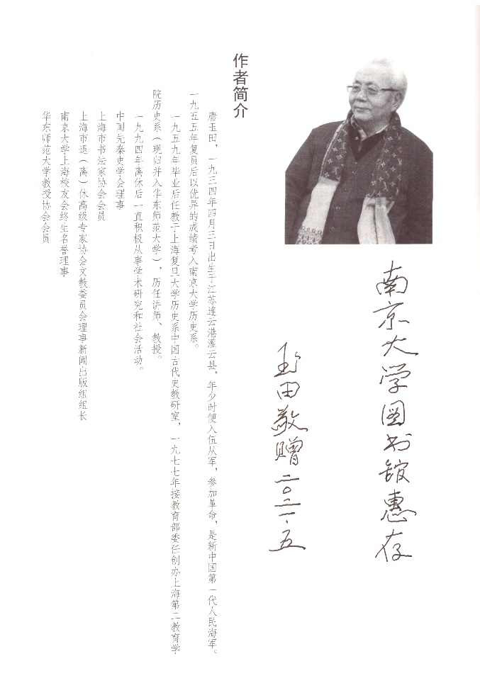 唐玉田,1934年4月3日出生于江苏连云港灌云县,年少时便入伍从军,参加革命,是新中国第一代人民海军。1955年复员后以优异的成绩考入南京大学历史系。1959年毕业后任教于上海复旦大学历史系中国古代史教研室,1977年接教育部委任创办上海第二教育学院历史系(现归并入华东师范大学),历任讲师、教授。1994年离休后一直积极从事学术研究和社会活动。现任中国先秦史学会理事、上海市书法家协会会员、南京大学上海校友会终身名誉理事等。