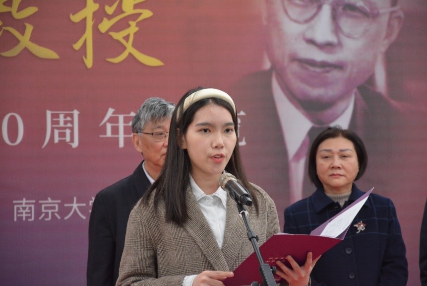 毓琇书院2022级新生相天歌作为学生代表发言,深切地表达了对顾毓琇先生的敬仰之情,表示一定不会忘记顾先生对青年的殷殷期待与谆谆教诲,将努力成为一名心系“国家事”,肩扛“国家责”、爱党报国、服务人民的新时代优秀南大青年。