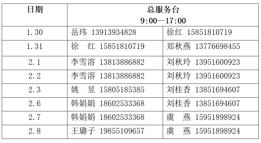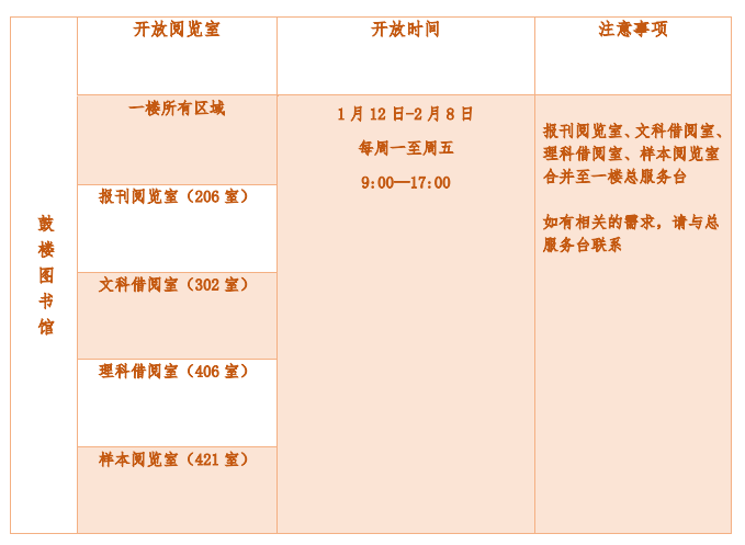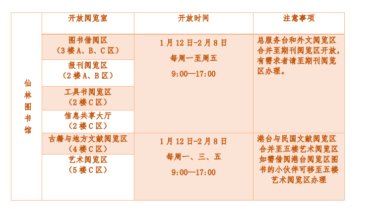 根据校办关于寒假工作安排的通知精神,本着确保广大读者教学科研和学习的需要,图书馆与学校部门进行协调,确定了开放时间。自1月12日至2月8日实行寒假开放作息时间,其中1月21至1月29日为春节假期,图书馆闭馆。2月9日各阅览室恢复正常开放。