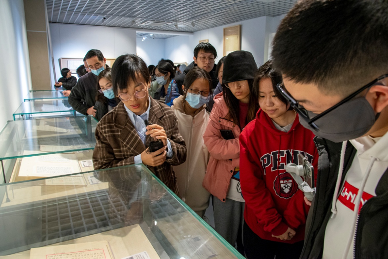 本次展览汇集了南京大学博物馆、图书馆、档案馆历年所收藏的近现代二百五十余位名家大师的三百多册件作品。展览根据所选人物分成“引子”“大学之路”“道启南雍”“松竹有林”“根深叶茂”五个部分。史梅馆长首先对本次展览的导言部分进行了介绍。随后,由博物馆和图书馆六位老师以接力导览的方式带领党员们依次浏览展览的五个部分。老师们详细介绍每个部分的内容和背景,讲解每个名人的特点和贡献,党员同志们从展览中获益良多。