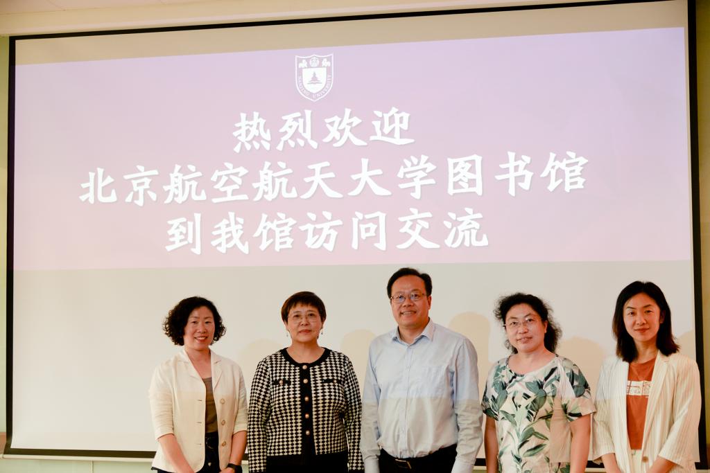 2023年4月19日,北京航空航天大学图书馆副馆长郭姝、办公室主任王彦来南京大学图书馆调研交流。南京大学图书馆馆长黄贤金、办公室主任陈宏、古籍特藏部主任李丹参加。