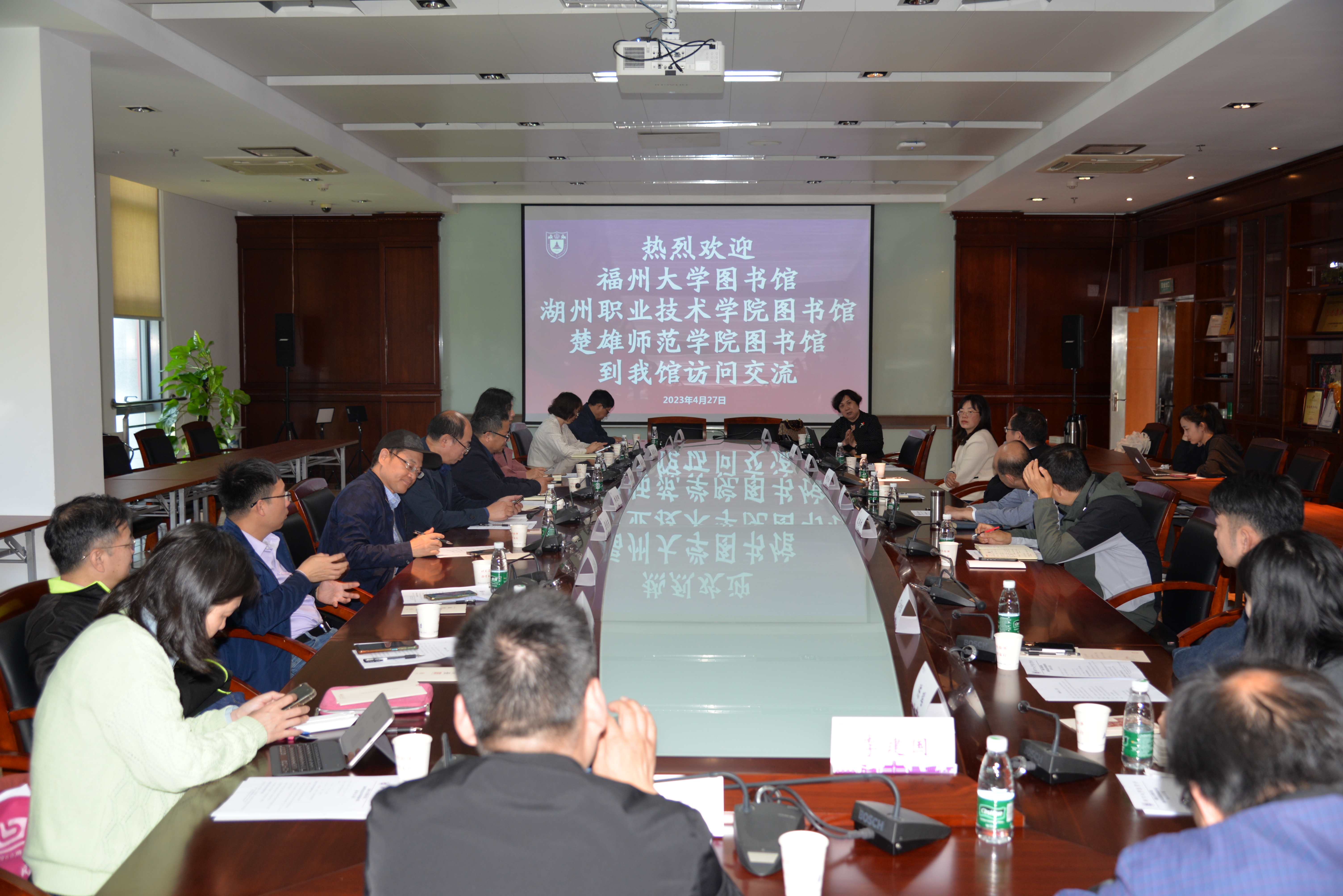 2023年4月27日,楚雄师范学院图书馆馆长周明武一行3人、福州大学图书馆副馆长林熙阳一行5人及湖州职业技术学院、湖州学院、湖州师范学院等图书馆馆长嵇美华一行7人来南京大学图书馆调研交流。南京大学图书馆馆长黄贤金、副书记、副馆长罗钧、办公室主任陈宏、系统保障部主任沈奎林、读者服务部主任张薇参加。